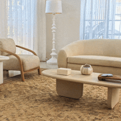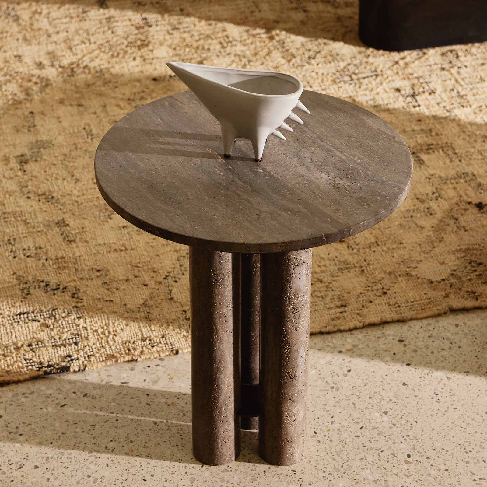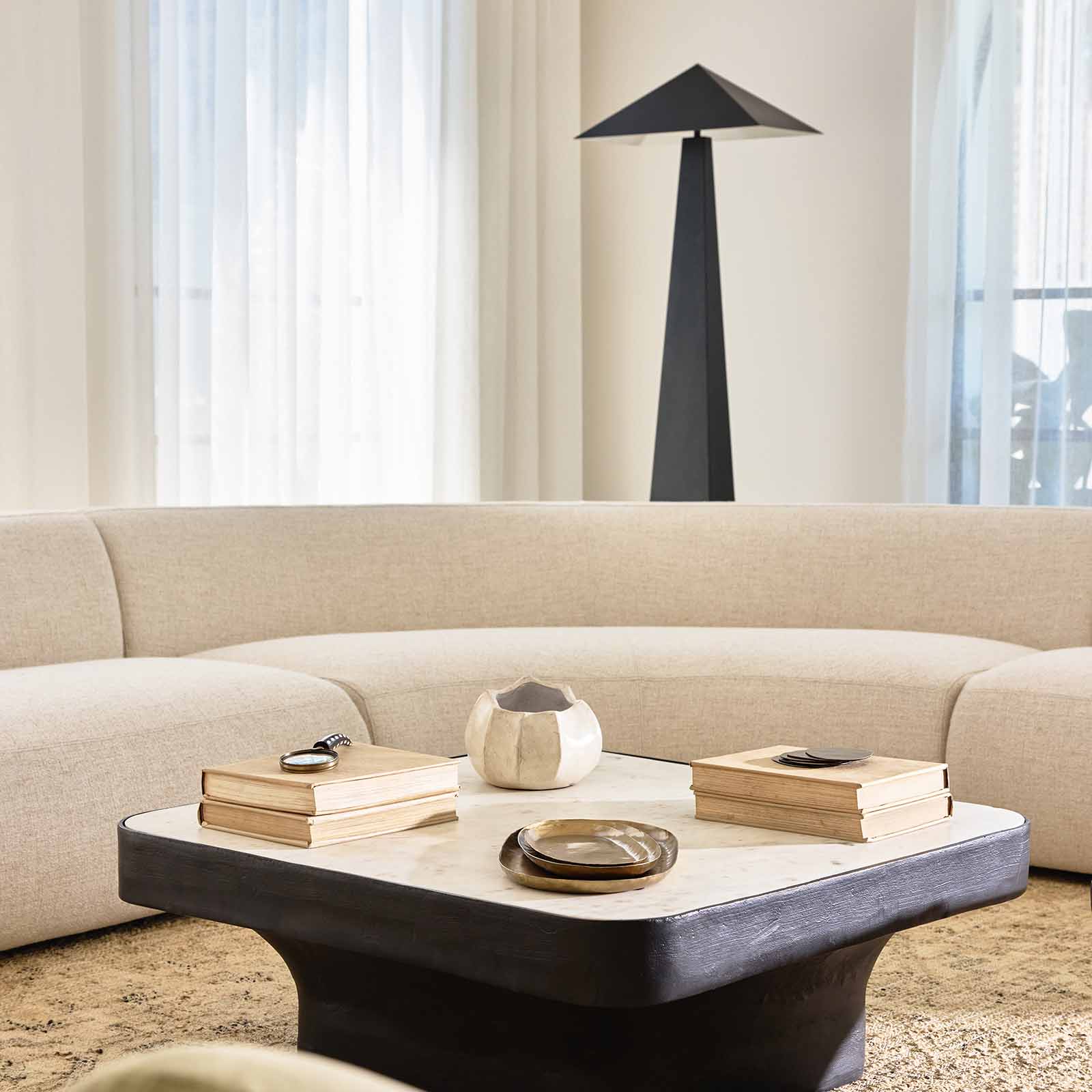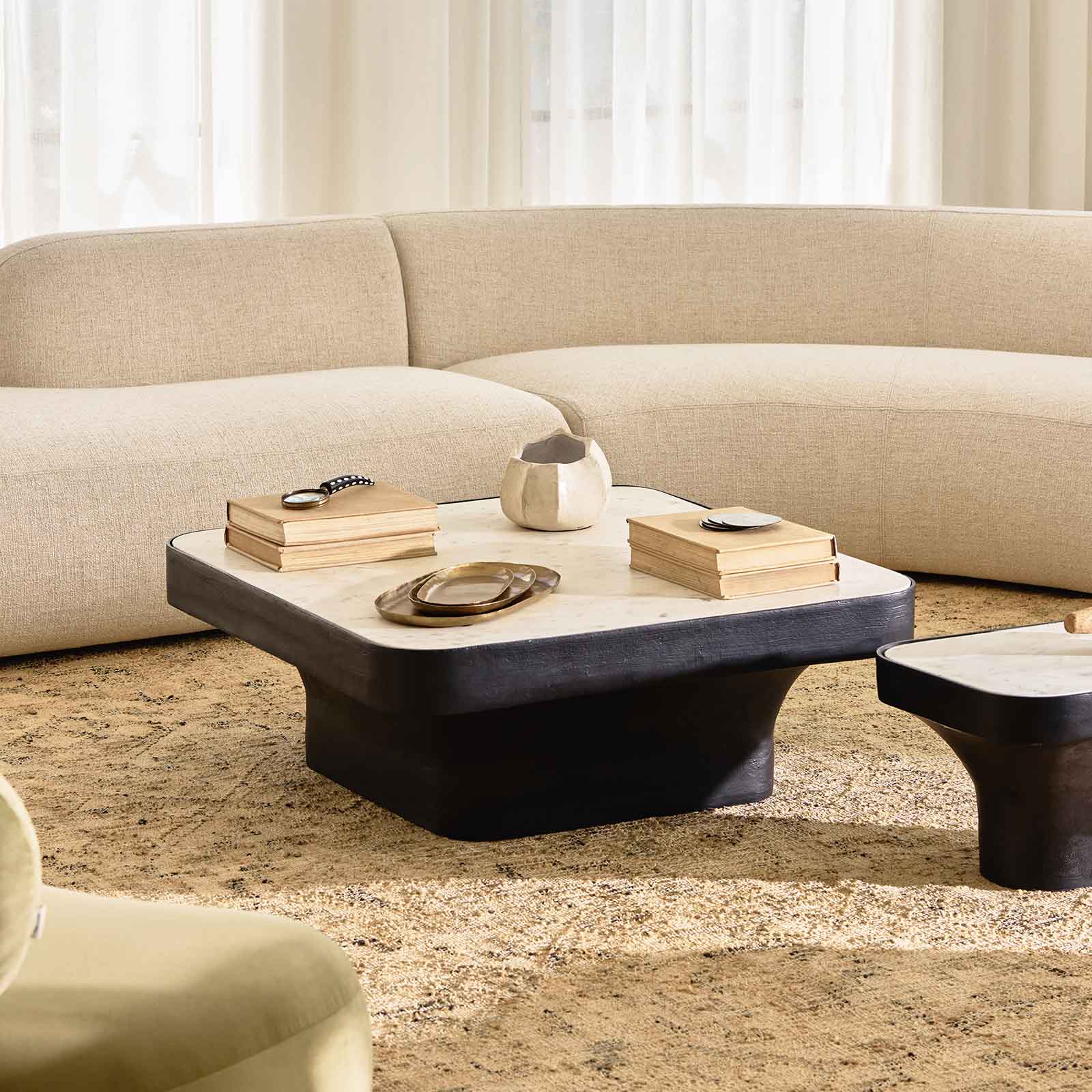 Introducing contrast and grounding the layout, the Indu Travertine Side Table adds organic texture and tonal depth. At the centre, the Malmo Marble Coffee Tables—in both large and small—demonstrate how considered form and materiality can effortlessly elevate the mood of a room.