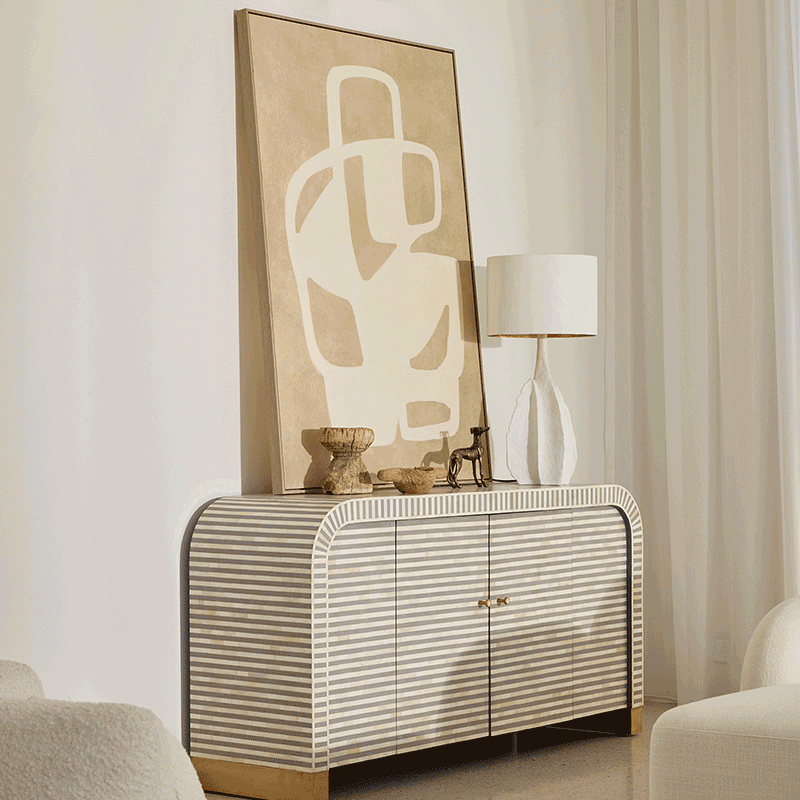 The Argo Marble Coffee Table grounds the space with its striking black top and curved marble legs, adding both texture and tonal depth. Nearby, the Hugo Bone Inlay Sideboard in Grey introduces subtle pattern and elegance, styled with the sculptural Mateo Table Lamp and the charming Rudi Greyhound Sculpture in Brass.