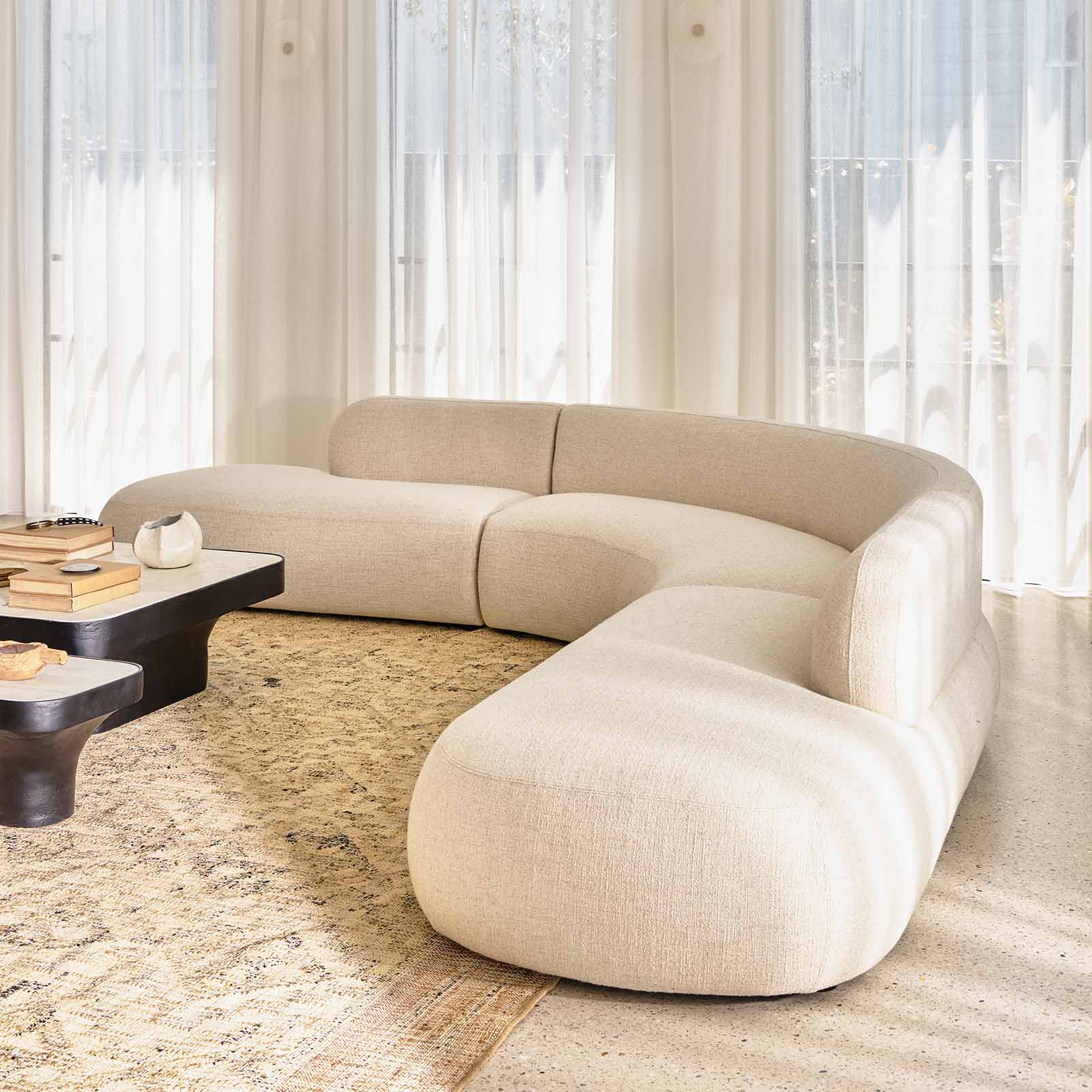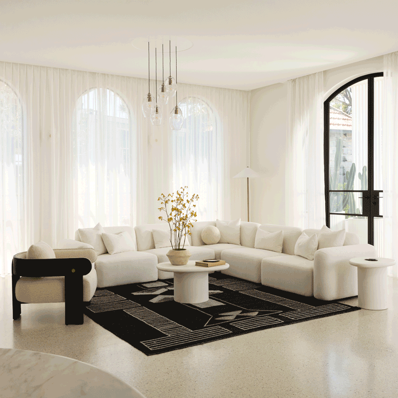 The home's architectural features—curved openings, high ceilings, and a minimalist colour palette—set the tone for the shoot. They allowed our furniture and homewares to speak for themselves while complementing the overall mood we hoped to create: warm, elegant, and lived-in.