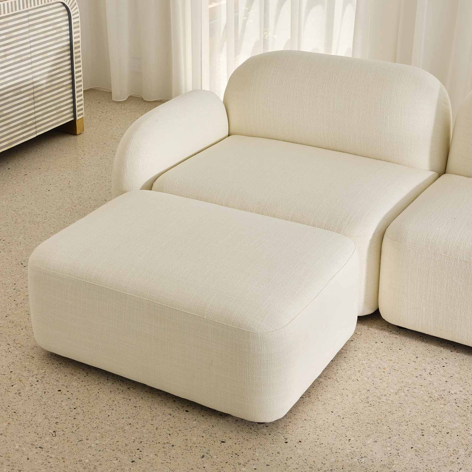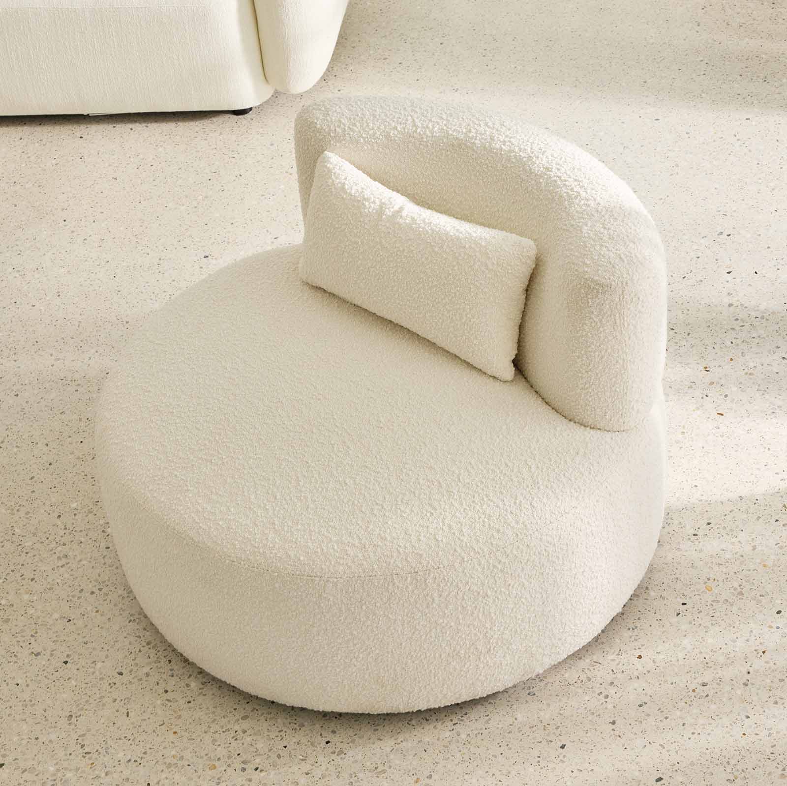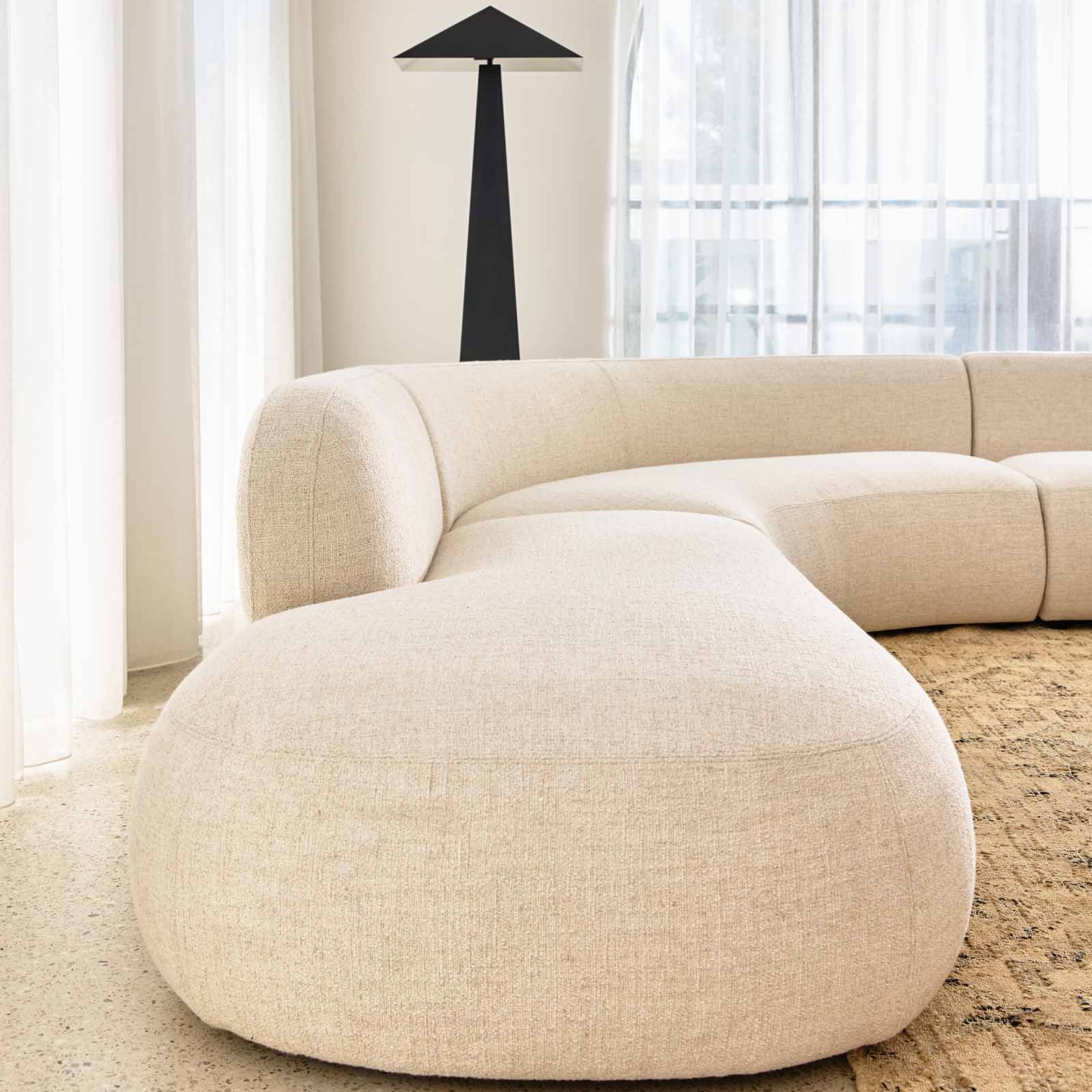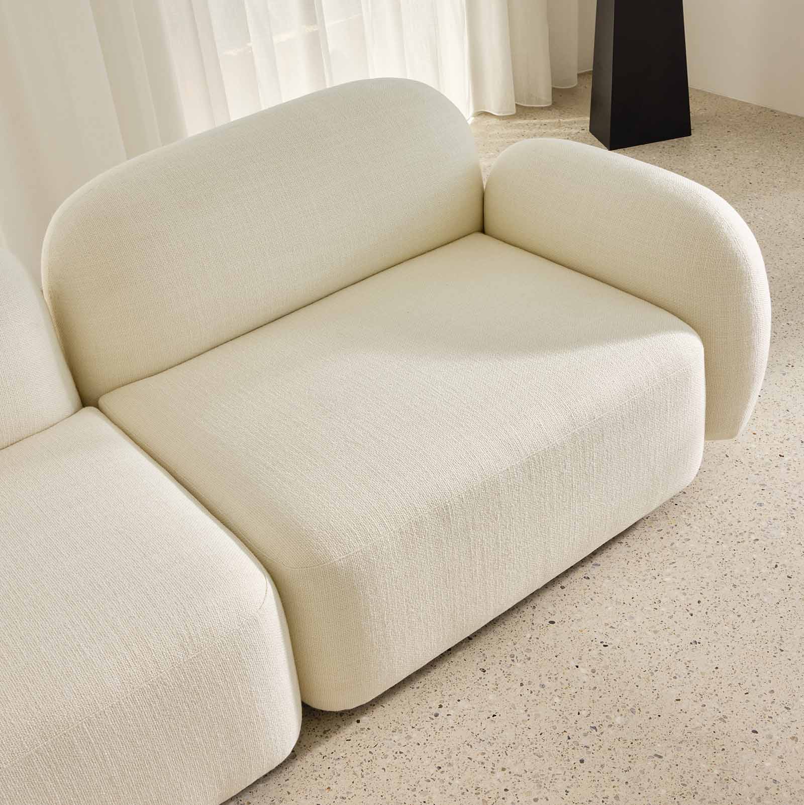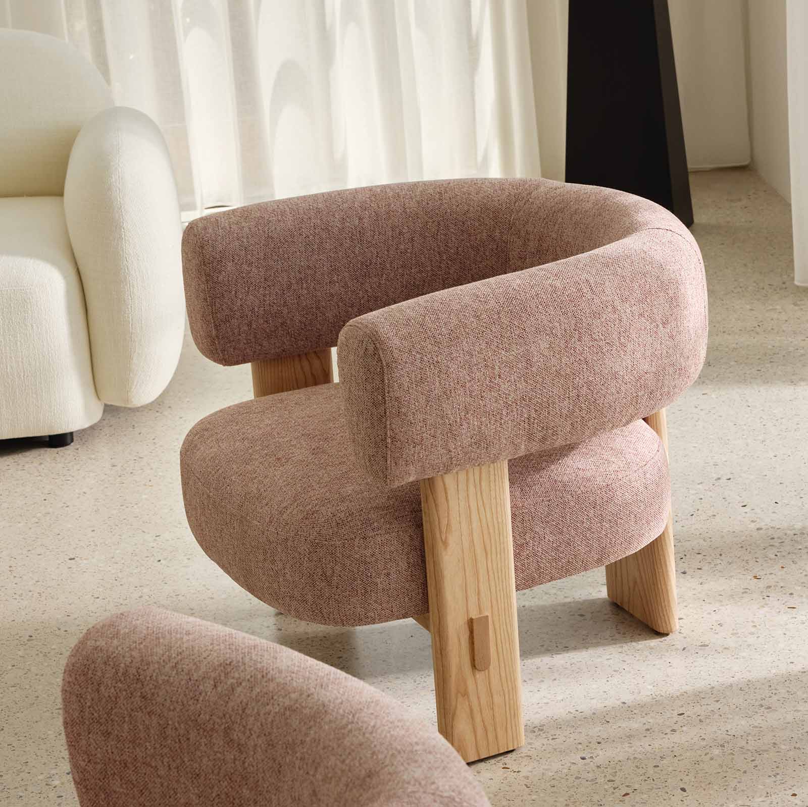 In this room, the Oslo Modular Sofa in Frosted Ivory takes centre stage, its curved silhouette echoing the home’s architectural softness. Paired with the Thea Occasional Chair in Berry, the combination strikes a bold yet balanced contrast—playful, sculptural, and refined.