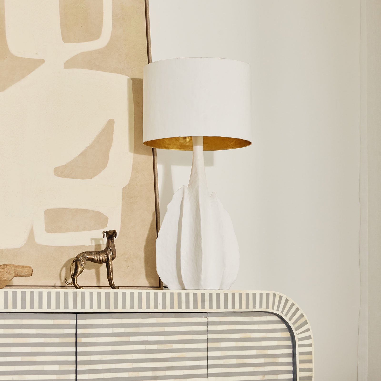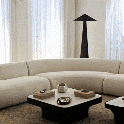 The Kezu Floor Lamp anchors a corner with understated elegance, styled alongside our signature ceramic vases and sculptural trays to complete the scene. The space embraces a warm, neutral palette with layered textures and soft light, creating a design-led setting that feels both refined and inviting.