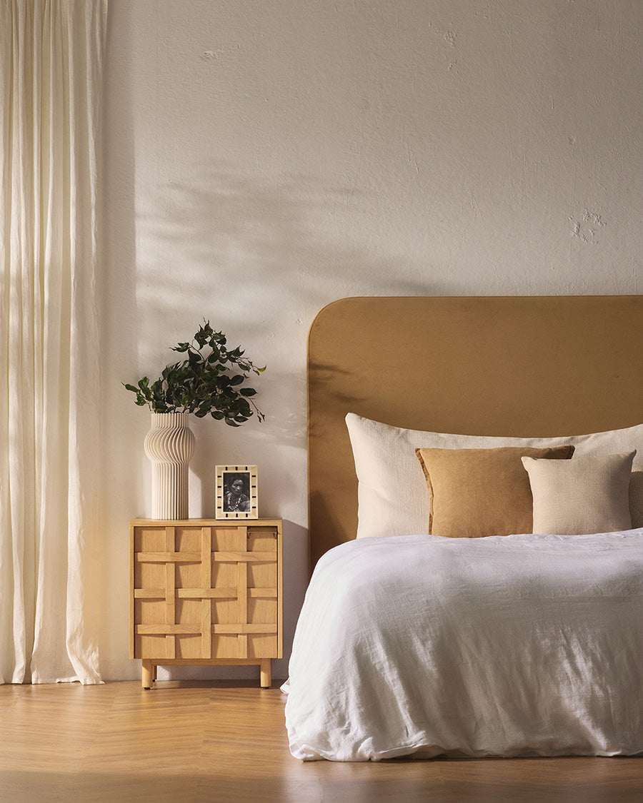Layering is key. Soft linen bedding, textured throws, cushions in complementary tones and gentle lighting all create depth. The right lamp on a bedside table adds warmth and creates a gentle ambience during the evening. A well-placed vase with soft florals introduces freshness and movement, softening the structure of the room.