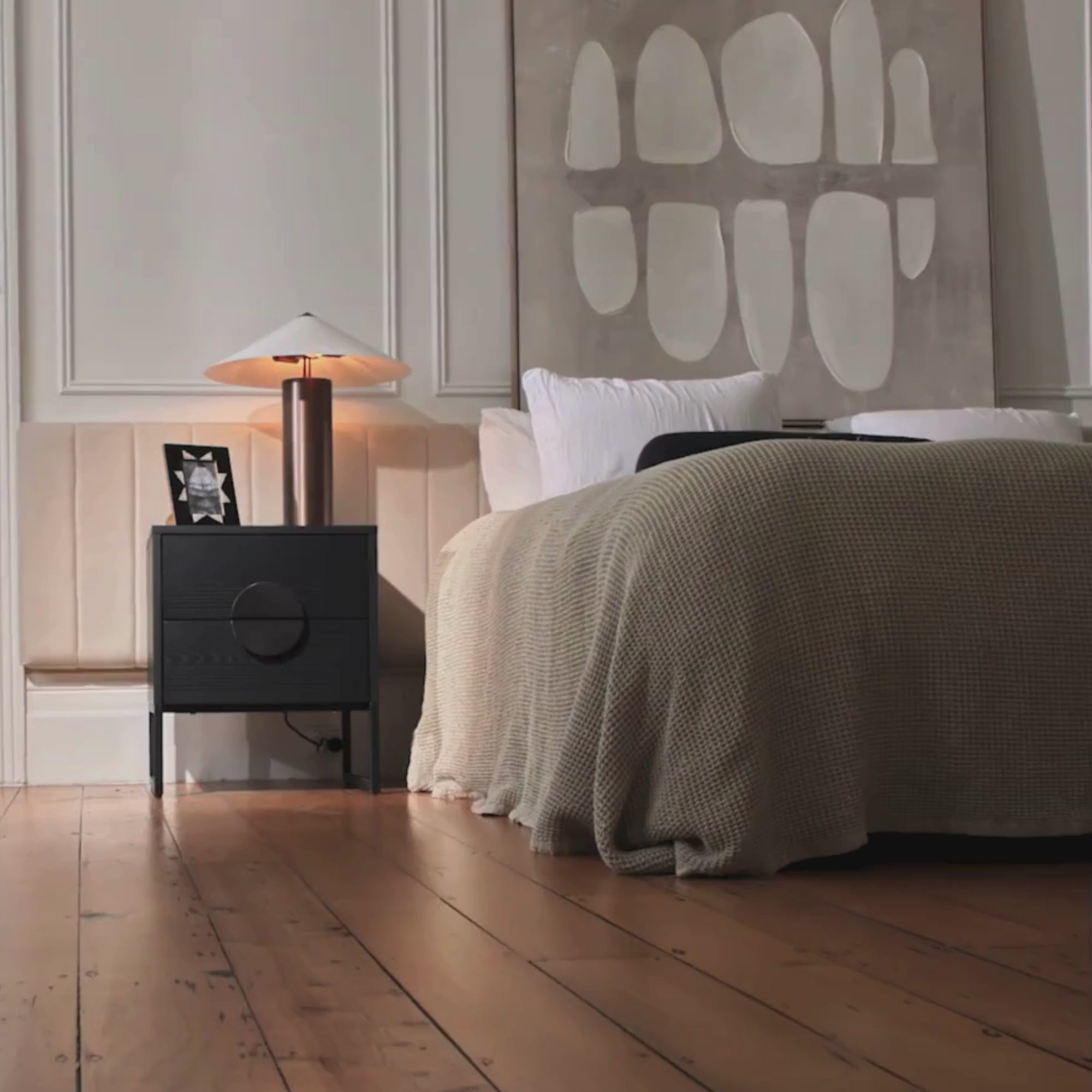 Our Aiko Table lamp is a timeless statement piece. With a simplistic design, dark bronze base & white metal peaked shade with a bronze cap, this modernist table lamp blends effortlessly with minimalistic spaces, showcasing its contemporary feel. Focusing on clean & simple form, the Aiko Table Lamp delivers on every level. Black textile cord, length 150 cm with line on/off switch. Uses 2 x E27 MAX 28W globes (globes not included).