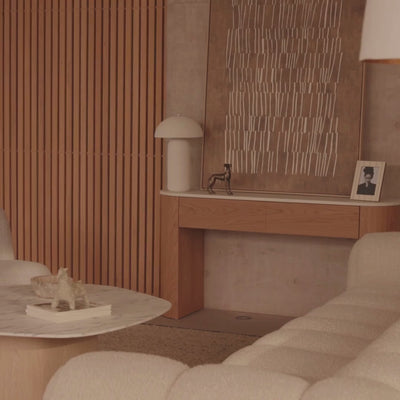 The Axel Console in Natural strikes a refined balance between sculptural form and everyday function. Featuring softly curved ends and a matte white Athena marble top with distinctive veining, it pairs beautifully with the warmth and texture of its oak veneer body. Two push-to-open drawers offer discreet storage, maintaining a clean, minimalist profile. With its elegant proportions and thoughtful materiality, Axel introduces an understated sense of luxury—ideal for refined entryways, living spaces, or interiors where form meets function.