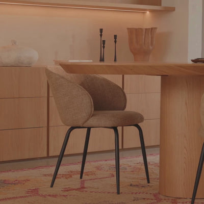 The Juno Dining Chair is a perfect balance of style and comfort, making it a sophisticated addition to any modern dining space. Its gently curved backrest and generously padded seat offer excellent support, while the soft textured weave upholstery in an oat colour brings warmth and elegance. The sturdy, powder-coated black metal frame provides a bold contrast, enhancing its contemporary appeal. With its sleek and versatile design, the Juno seamlessly pairs with both new and existing dining tables.