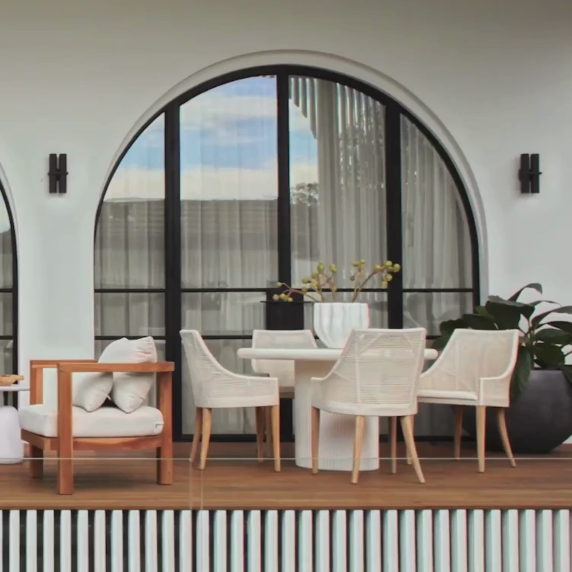 1 ONLY AVAILABLE. The Remi Outdoor Dining Chairs in white are timelessly stylish chairs that will look great in your alfresco dining area. With white wash teak legs, synthetic rattan weave back & arm supports, & padded seat upholstered in 100% olefin outdoor fabric, the Remi provides a look that is both coastal casual as well as refined & upscale while the rich blend of natural materials add textural interest. We recommend removing the seat when not in use & store indoors or under cover.