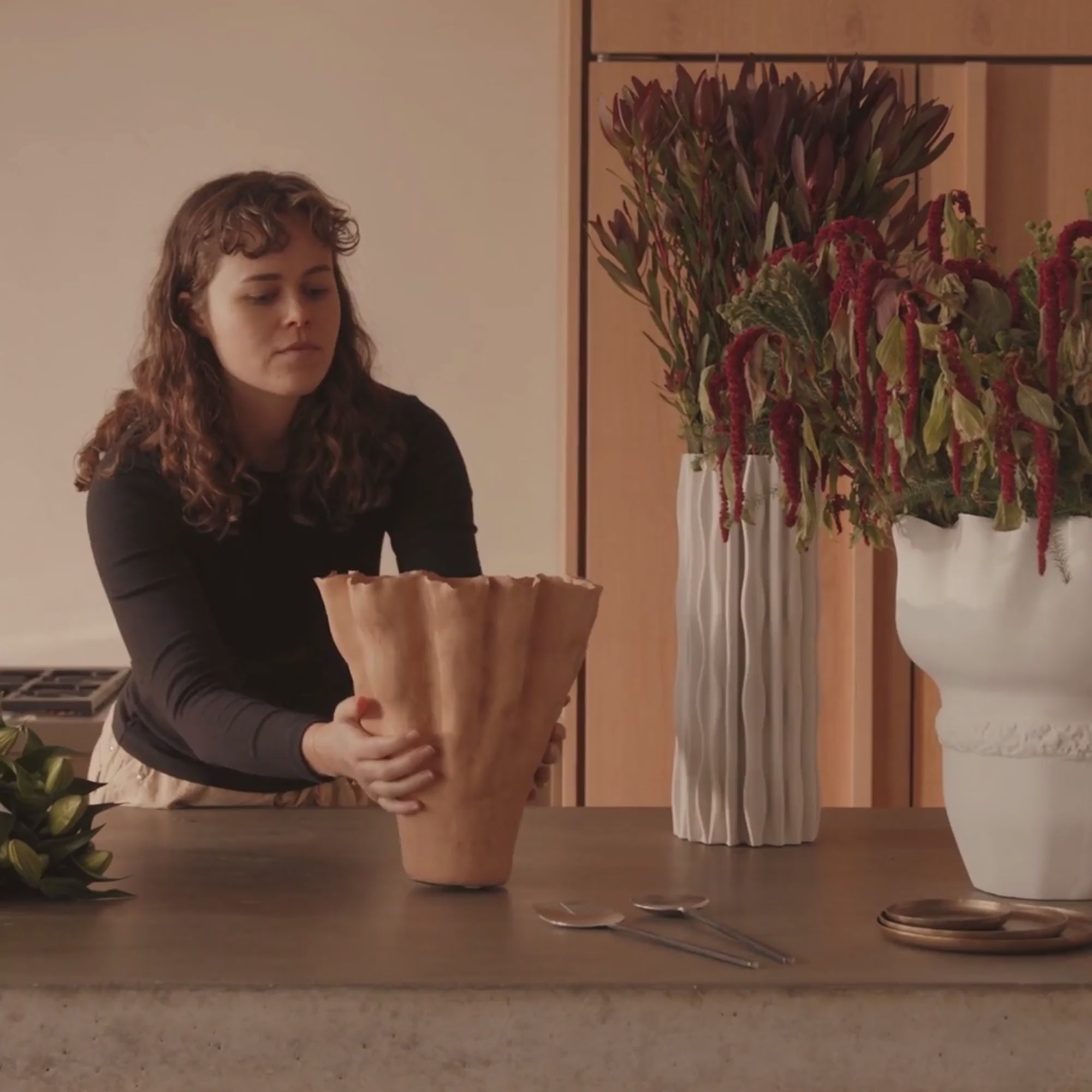 The Sara Vase is a sculptural statement that blends function with art. Its matte earth brown finish is hand-glazed, coloured, and textured, with 100% ceramic craftsmanship showcasing natural variations in colour, size, and finish. The fluted form is crowned with intricately shaped petal edging, making each piece truly unique. Designed by Horgans, Sara blends bold visual appeal with the impact of a curated gallery piece. Whilst the interior of this item features a waterproof lining, due to the handmade craftsmanship & nature of the materials, complete waterproofing cannot be guaranteed. Please note, the waterproofing treatment extends only to approximately one-third of the interior depth, so do not overfill. If using with water, we recommend testing thoroughly and monitoring over time to ensure optimal performance.